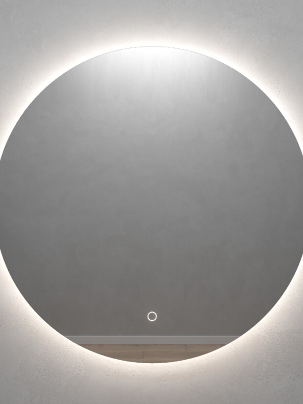 Безрамное зеркало круглой формы с контурной (тыльной) нейтральной подсветкой, свет 4000К. Подложка из высококачественного МДФ, светодиодная лента защищена матовым свето-рассеивателем от попадания пыли и влаги. Есть вывод 220W для подключения к сети, включение подсветки от сенсорной кнопки на зеркале.